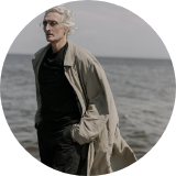 Вид сбоку при приглушенном освещении, держит предмет.